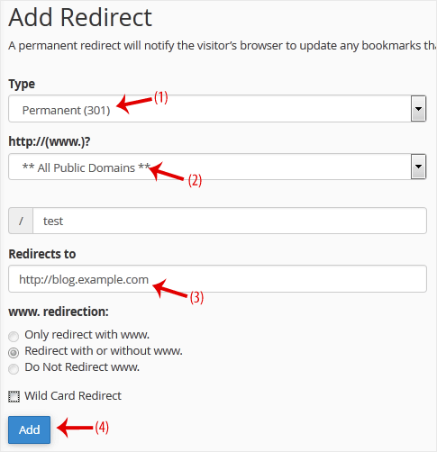 3. Under Add Redirect, you should enter the following details and choose the appropriate options.