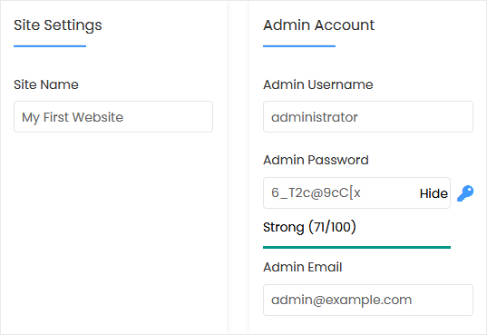 • Admin Username: Your new Vanilla username (for security reasons, do not use the administrator or the admin username).